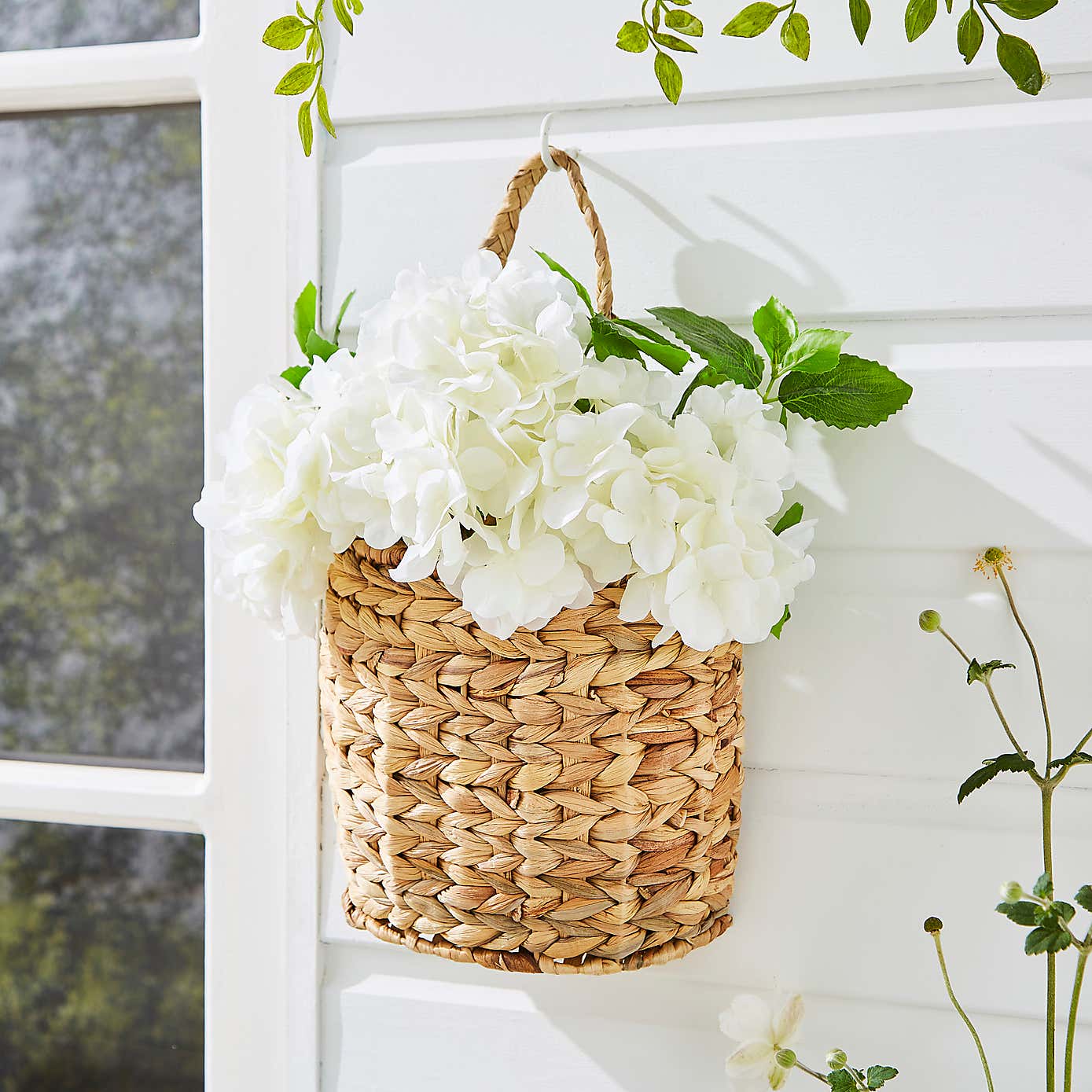 Artificial White Hydrangea in Hanging Basket