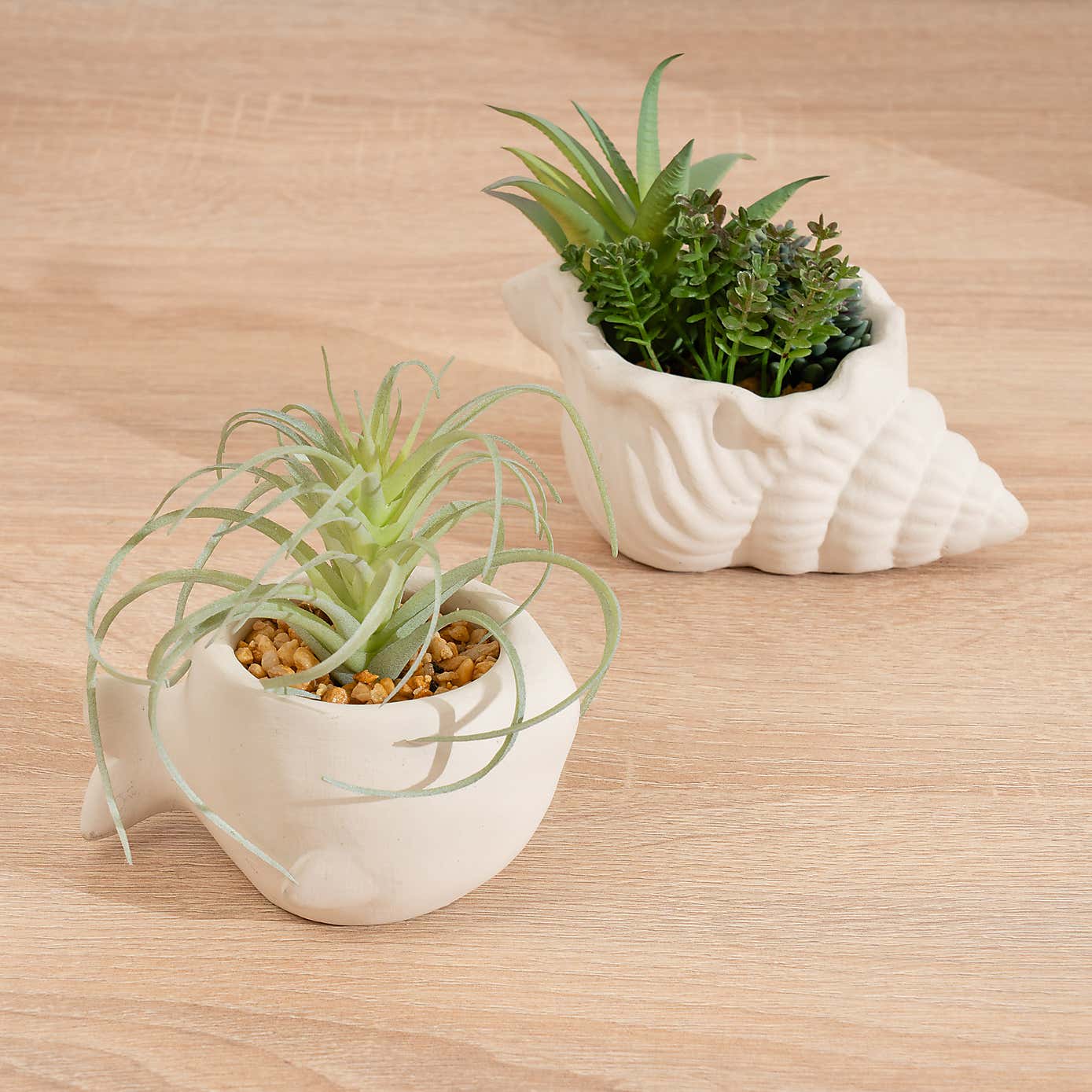 Set of 2 Artificial Succulents in Cement Fish & Shell Plant Pots